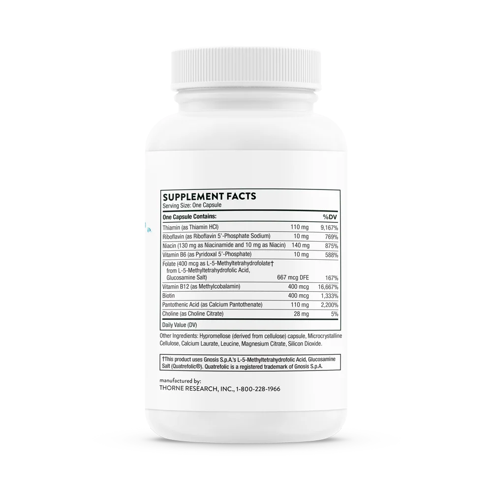 Thiamin (as Thiamin HCl), Riboflavin (as Riboflavin 5'-Phosphate Sodium), Niacin (130 mg as Niacinamide and 10 mg as Niacin), Vitamin B6 (as Pyridoxal 5'-Phosphate), Folate (400 mcg as L-5-Methyltetrahydrofolate from L-5-Methyltetrahydrofolic Acid, Glucosamine Salt), Vitamin B12 (as Methylcobalamin), Biotin, Pantothenic Acid (as Calcium Pantothenate), Choline (as Choline Citrate), Hypromellose (derived from cellulose) capsule, Microcrystalline Cellulose, Calcium Laurate, Leucine, Magnesium Citrate, Silicon Dioxide.