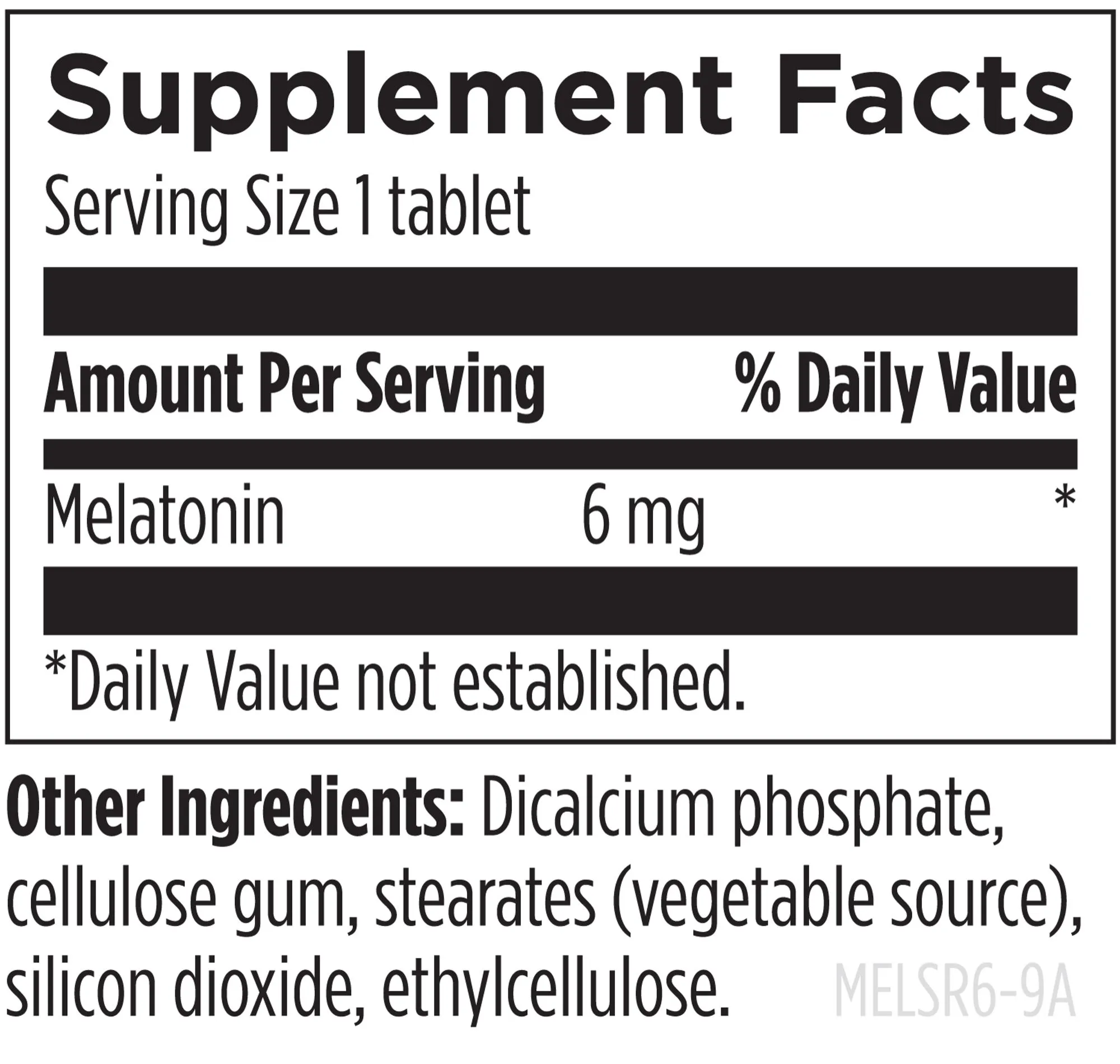 Melatonin, Dicalcium phosphate, cellulose gum, stearates (vegetable source), silicon dioxide, ethylcellulose.