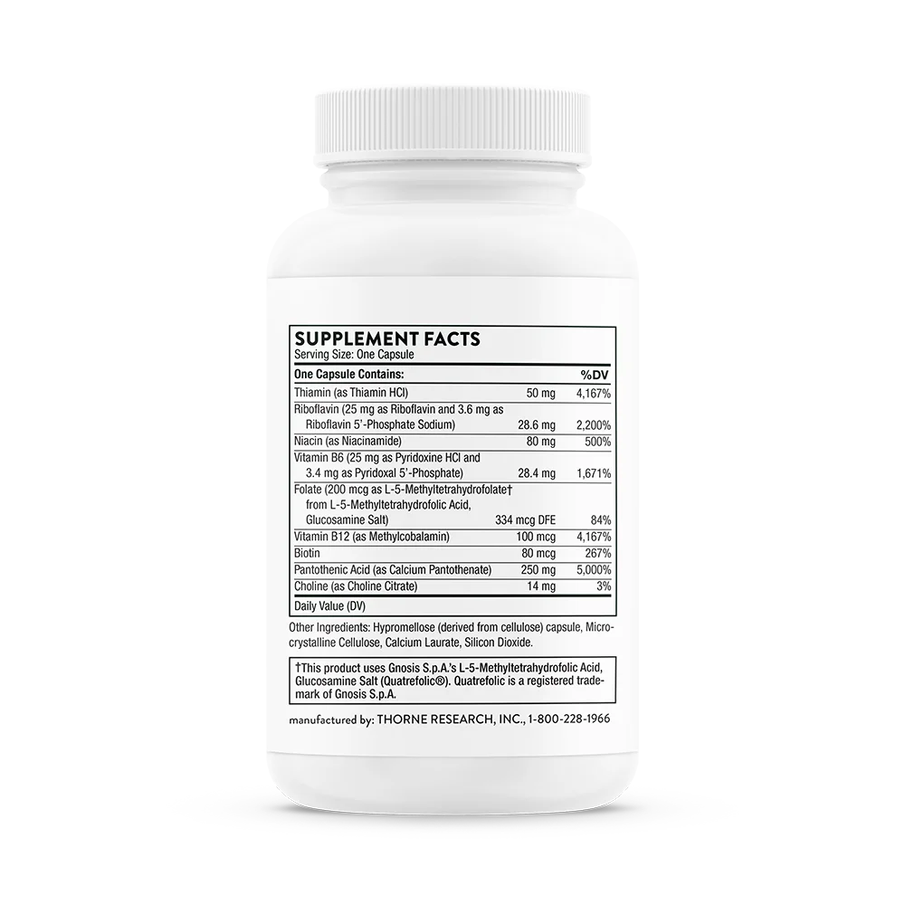 Thiamin (as Thiamin HCl), Riboflavin (25 mg as Riboflavin and 3.6 mg as Riboflavin 5'-Phosphate Sodium), Niacin (as Niacinamide), Vitamin B6 (25 mg as Pyridoxine HCl and 3.4 mg as Pyridoxal 5'-Phosphate), Folate (200 mcg as L-5-Methyltetrahydrofolate from L-5-Methyltetrahydrofolic Acid, Glucosamine Salt), Vitamin B12 (as Methylcobalamin), Biotin, Pantothenic Acid (as Calcium Pantothenate), Choline (as Choline Citrate), Hypromellose (derived from cellulose) capsule, Microcrystalline Cellulose, Calcium Laurate, Silicon Dioxide.