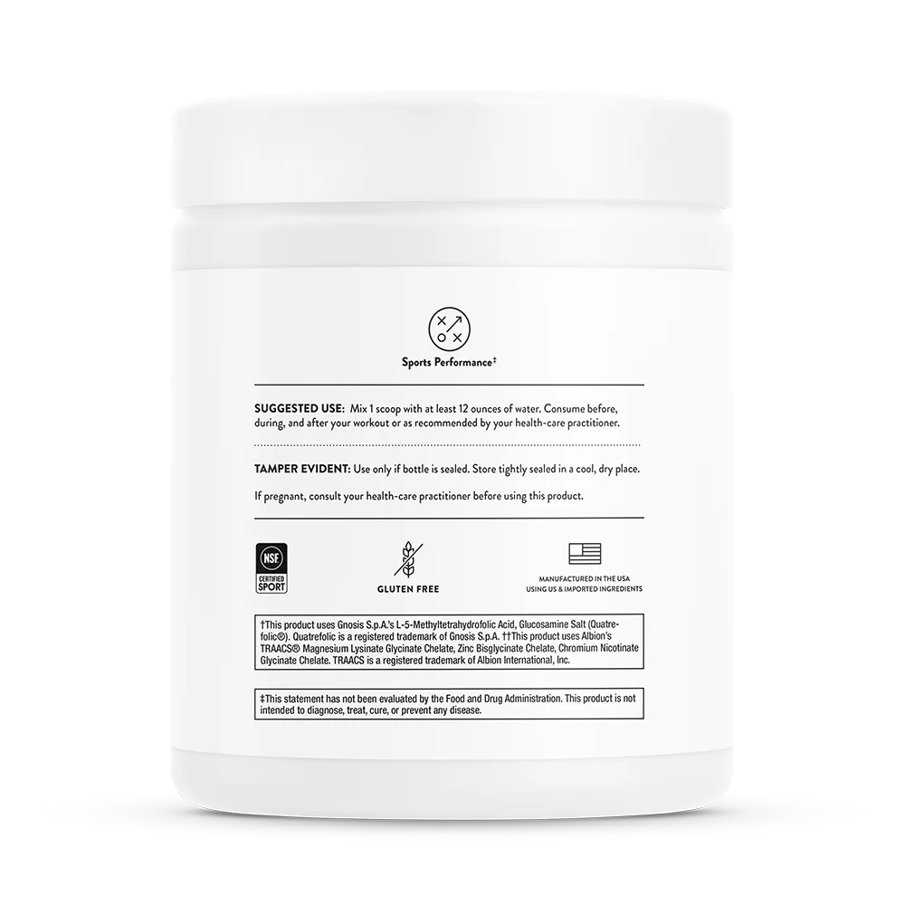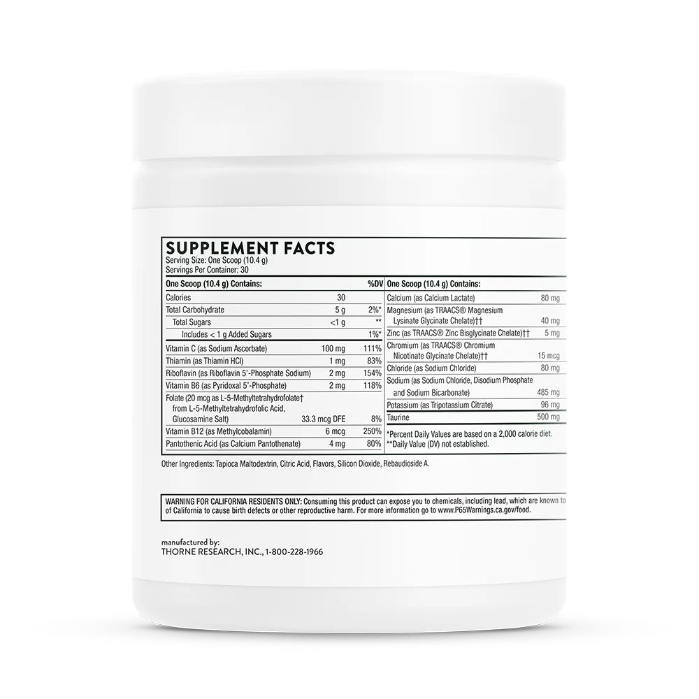 Total Carbohydrate, Vitamin C (as Sodium Ascorbate), Thiamin (as Thiamin HCl), Riboflavin (as Riboflavin 5'-Phosphate Sodium), Vitamin B6 (as Pyridoxial 5'-Phosphate), Folate (20 mcg as L-5-Methyltetrahydrofolate from L-5-Methyltetrahydrofolic Acid, Glucosamine Salt), Vitamin B12 (as Methylcobalamin), Pantothenic Acid (as Calcium Pantothenate), Calcium (Calcium Lactate), Magnesium (as TRAACS® Magnesium Lysinate Glycinate Chelate), Zinc (as TRAACS® Zinc Bisglycinate Chelate), Chromium (as TRAACS® Chromium Nicotinate Glycinate Chelate), Chloride (as Sodium Chloride), Sodium (as Sodium Chloride, Disodium Phosphate, and Sodium Bicarbonate), Potassium (as Tripotassium Citrate), Taurine, Tapioca Maltodextrin, Citric Acid, Flavors, Silicon Dioxide, Rebaudioside A.