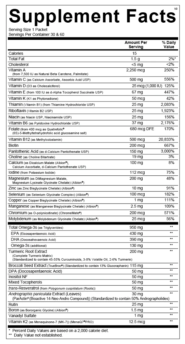 Calories, Total Fat, Cholesterol, Vitamin A (from 7,500 IU as Natural Beta Carotene, Palmitate), Vitamin C (as Calcium Ascorbate, Ascorbic Acid USP), Vitamin D (D3 as Cholecalciferol), Vitamin E (from 100 IU as d-Alpha Tocopherol Succinate USP), Vitamin K (K1 as Phytonadione), Thiamin (Vitamin B1, from Thiamine Hydrochloride USP), Riboflavin (Vitamin B2 USP), Niacin (as Niacin USP, Niacinamide USP), Vitamin B6 (as Pyridoxine Hydrochloride USP), Folate (from 400 mcg as Quatrefolic® (6S)-5-Methyltetrahydrofolic acid glucosamine salt), Vitamin B12 (as Methylcobalamin), Biotin, Pantothenic Acid (as d-Calcium Pantothenate USP), Choline (as Choline Bitartrate), Calcium (as Dicalcium Malate (Albion®), Calcium Ascorbate, d-Calcium Pantothenate USP), Iodine (from Potassium Iodide), Magnesium (as DiMagnesium Malate, Magnesium Lysinate Glycinate Chelate (Albion®)), Zinc (as Zinc Bisglycinate Chelate (Albion®)), Selenium (as Selenium Glycinate Complex (Albion®)), Copper (as Copper Bisglycinate Chelate (Albion®)), Manganese (as Manganese Bisglycinate Chelate (Albion®)), Chromium (as O-polynicotinate (ChromeMate®)), Molybdenum (as Molybdenum Glycinate Chelate (Albion®)), Total Omega-3s (as Triglycerides), EPA (Eicosapentaenoic Acid), DHA (Docosahexaenoic Acid), Omega-3s (additional), Turmeric Root Extract (Complete Turmeric Matrix, standardized to contain 45-55% Curcuminoids, 3-8% Volatile Oil, 2-6% Turmerin), Broccoli Seed Extract (TrueBroc®, standardized to contain 13% Glucoraphanin), DPA (Docosapentaenoic Acid), Inositol NF, Mixed Tocopherols, trans-Resveratrol (from Polygonum cuspidatum (Roots)), Andrographis paniculata Extract (Leaves, ParActin® (Bioactive 14-Neo-Andro Compound), standardized to contain 50% Andrographolides), Rutin, Boron (as Bororganic Glycine (Albion®)), Vanadyl Sulfate, Vitamin K2 (as Menaquinone-7 (MK-7) (MenaQ7®PRO))
