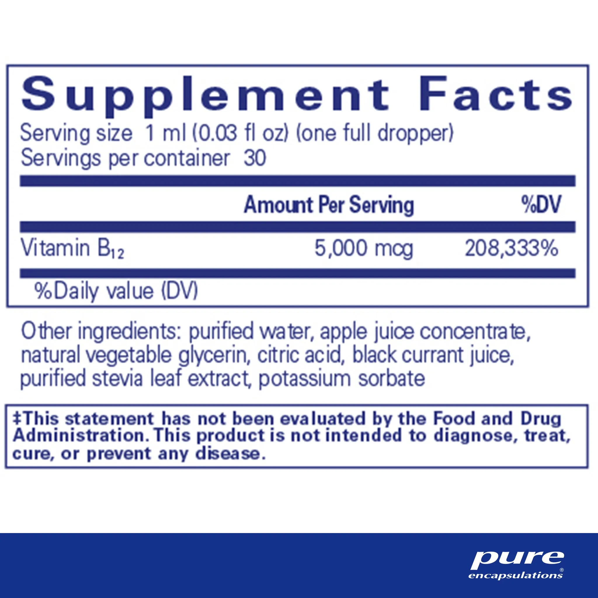 vitamin B12 (formualted with methylcobalamin), purified water, apple juice concentrate, natural vegetable glycerin, citric acid, potassium sorbate, purified stevia leaf extract