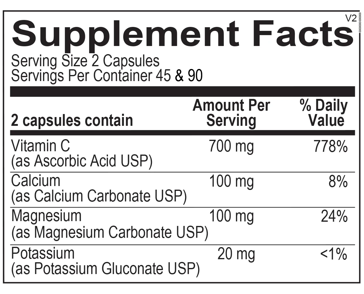 Vitamin C (as Ascorbic Acid USP), Calcium (as Calcium Carbonate USP), Magnesium (as Magnesium Carbonate USP), Potassium (as Potassium Gluconate USP)