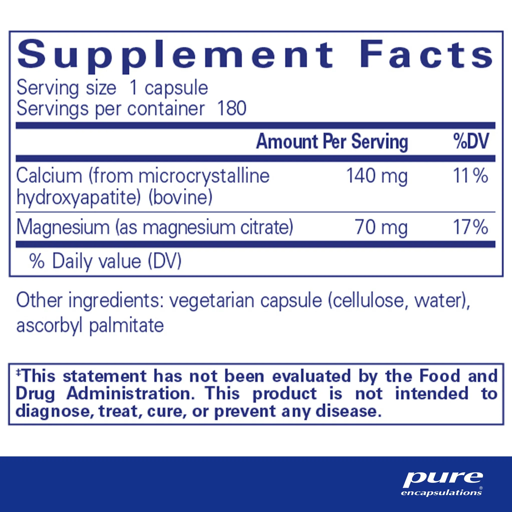 calcium (from microcrystalline hydroxyapatite) (bovine), magnesium (as magnesium citrate), vegetarian capsule (cellulose, water), ascorbyl palmitate
