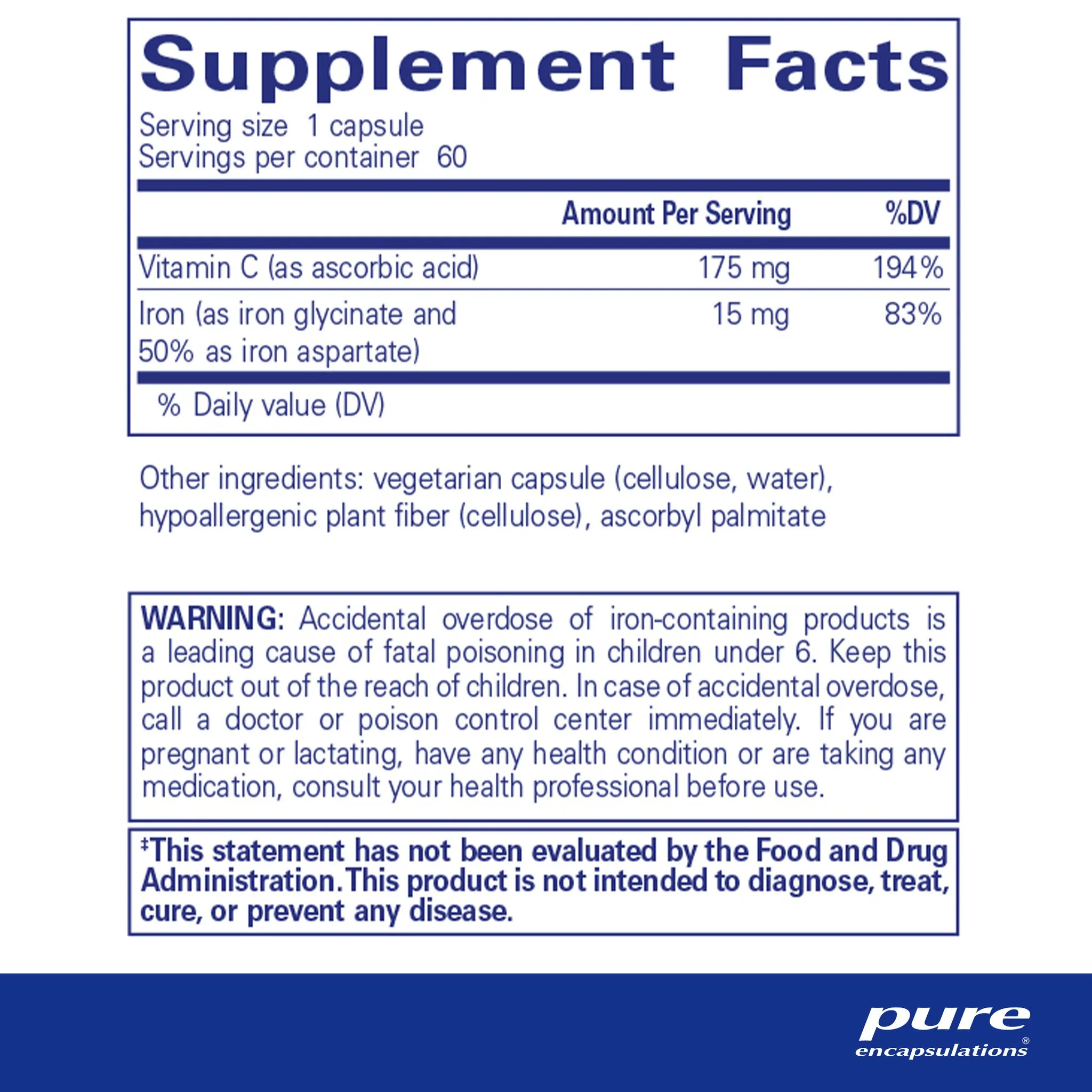 vitamin C (as ascorbic acid), iron (as iron glycinate and 50% as iron aspartate), vegetarian capsule (cellulose, water), hypoallergenic plant fiber (cellulose), ascorbyl palmitate