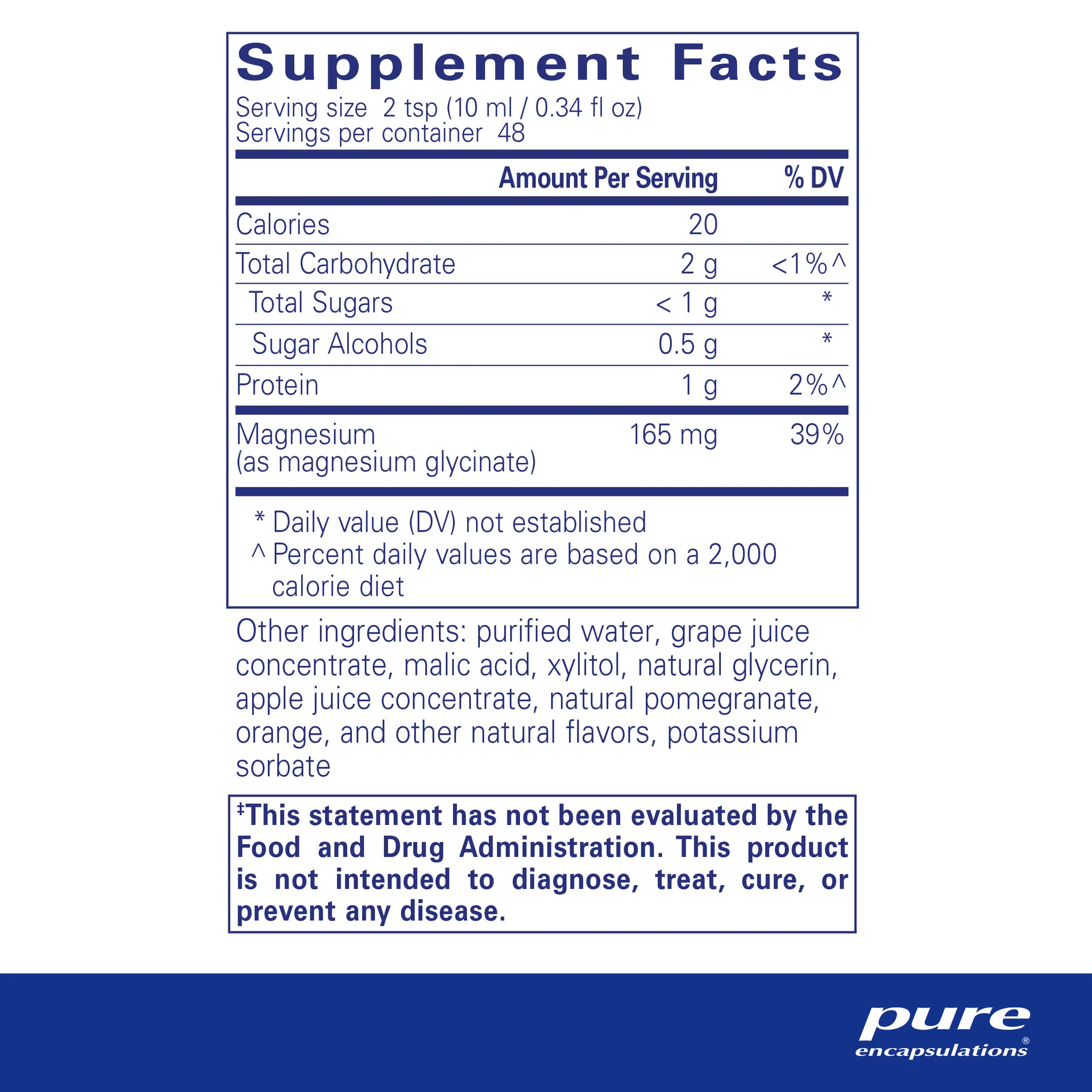 magnesium (as magnesium glycinate), purified water, grape juice concentrate, malic acid, xylitol, natural glycerin, apple juice concentrate, natural pomegranate, orange and other natural flavors, potassium sorbate