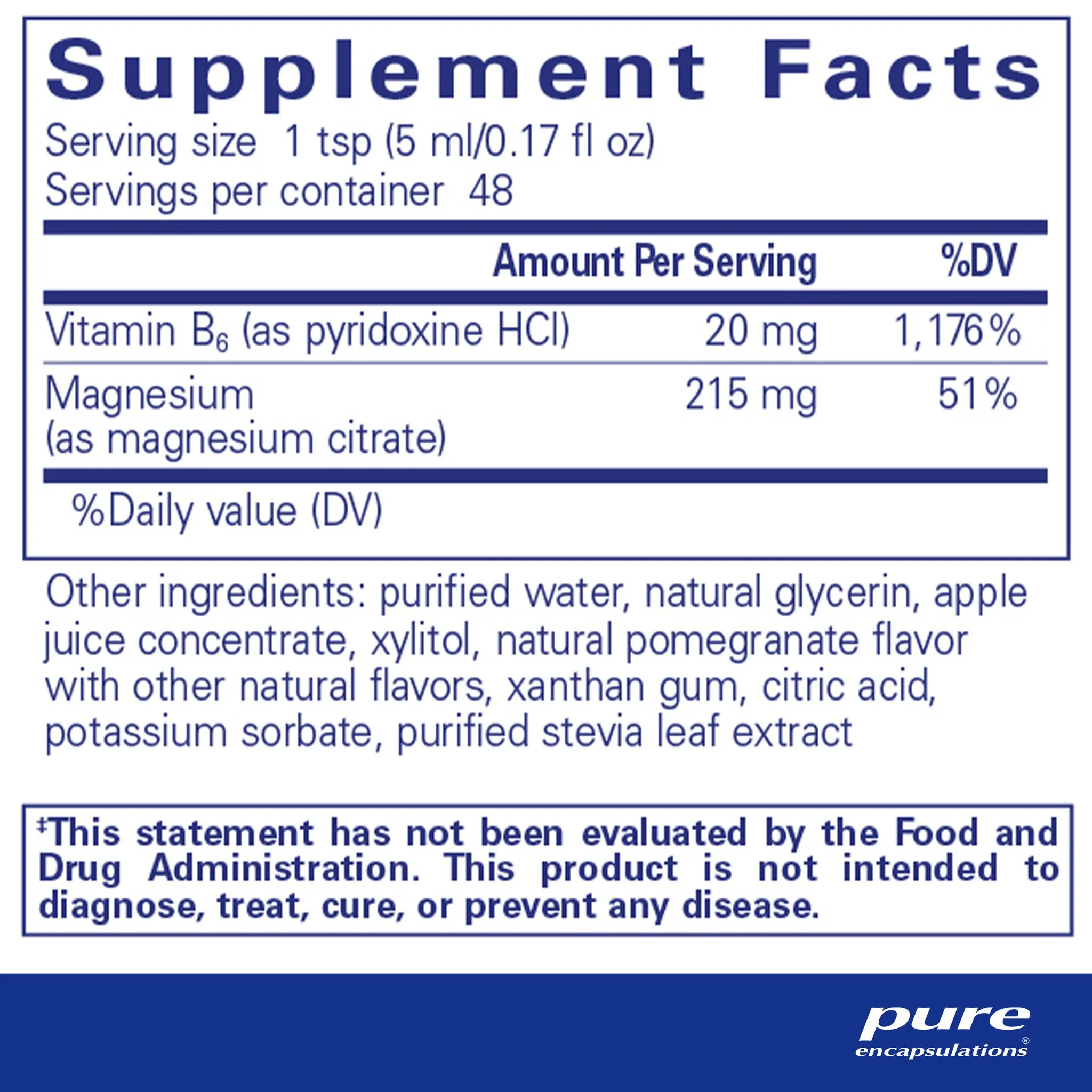 vitamin B6 (as pyridoxine HCl), magnesium (as magnesium citrate), purified water, natural glycerin, apple juice concentrate, xylitol, natural pomegranate flavor with other natural flavors, xanthan gum, citric acid, potassium sorbate, purified stevia leaf extract