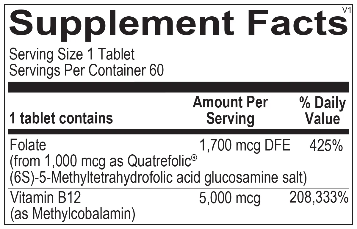 Folate (from 1,000 mcg as Quatrefolic® (6S)-5-Methyltetrahydrofolic acid glucosamine salt), Vitamin B12 (as Methylcobalamin)