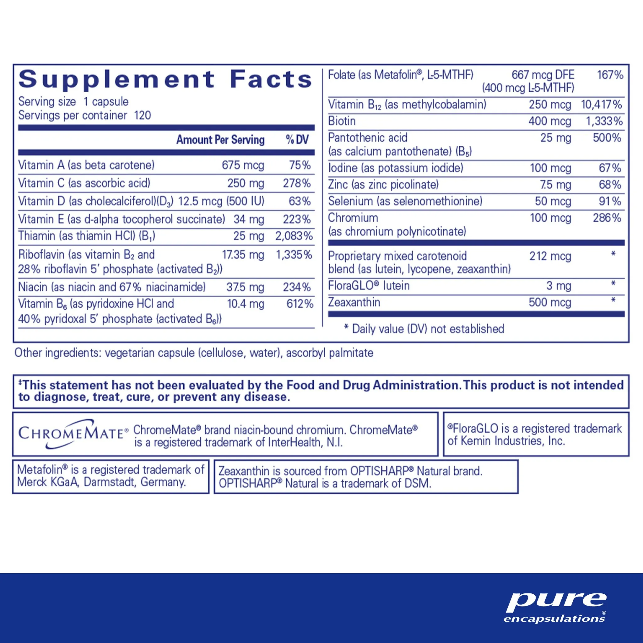 vitamin A (as beta carotene), vitamin C (as ascorbic acid), vitamin D (as cholecalciferol)(D3) (500 IU), vitamin E (as d-alpha tocopherol succinate), thiamin (as thiamin HCl) (B1), riboflavin (as vitamin B2 and 28% as riboflavin 5' phosphate (activated B2)), niacin (as niacin and 67% niacinamide), vitamin B6 (as pyridoxine HCl and 40% as pyridoxal 5' phosphate (activated B6)), folate (as Metafolin®, L-5-MTHF), vitamin B12 (as methylcobalamin), biotin, pantothenic acid (as calcium pantothenate) (B5), iodine (as potassium iodide), zinc (as zinc picolinate), selenium (as selenomethionine), chromium (as chromium polynicotinate), proprietary mixed carotenoid blend, FloraGLO® lutein, zeaxanthin, vegetarian capsule (cellulose, water) , ascorbyl palmitate