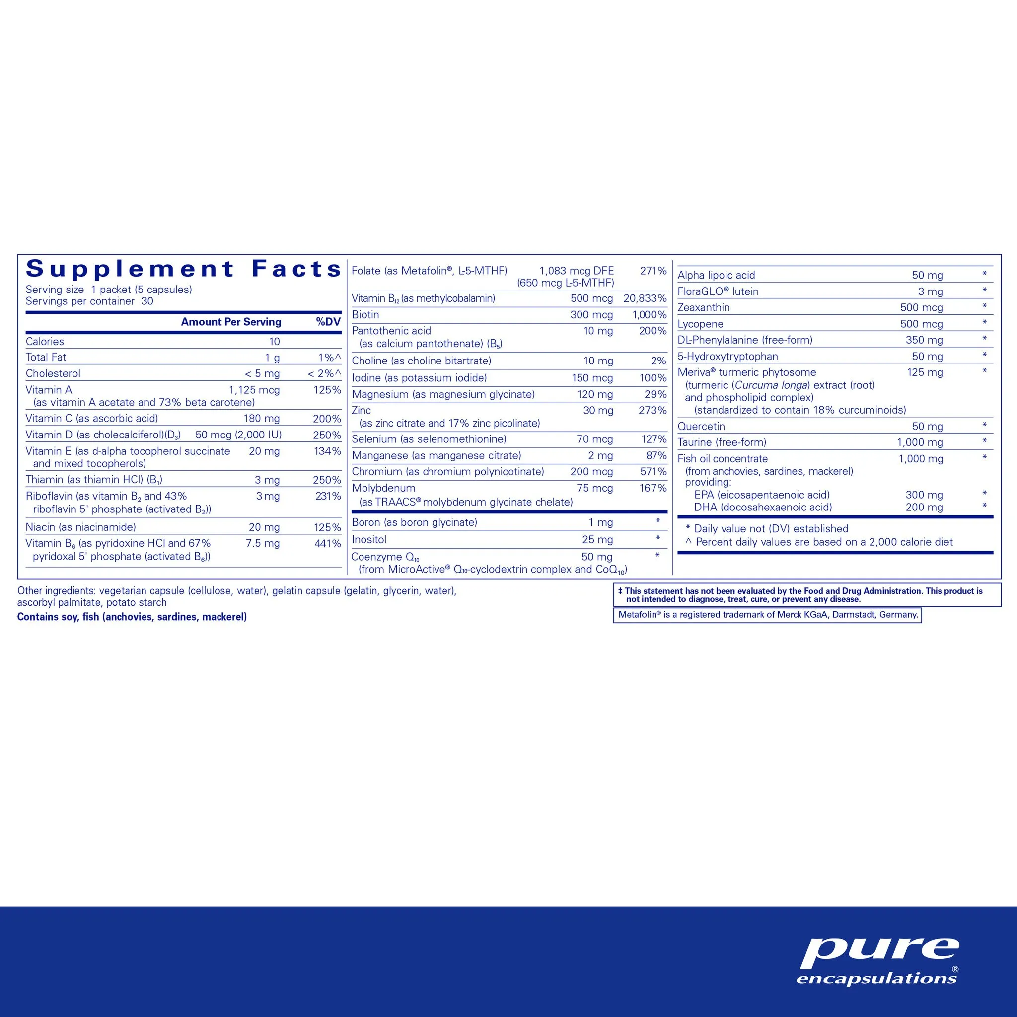 calories, total fat, cholesterol, vitamin A (as vitamin A acetate and 73% beta carotene), vitamin C (as ascorbic acid), vitamin D (as cholecalciferol)(D3), vitamin E (as d-alpha tocopherol succinate and mixed tocopherols), thiamin (as thiamin HCl) (B1), riboflavin (as vitamin B2 and 43% riboflavin 5' phosphate (activated B2)), niacin (as niacinamide), vitamin B6 (as pyridoxine HCl and 67% pyridoxal 5' phosphate (activated B6)), folate (as Metafolin®, L-5-MTHF), vitamin B12 (as methylcobalamin), biotin, pantothenic acid (as calcium pantothenate) (B5), choline (as choline bitartrate), iodine (as potassium iodide), magnesium (as magnesium glycinate), zinc (as zinc citrate and 17% zinc picolinate), selenium (as selenomethionine), manganese (as manganese citrate), chromium (as chromium polynicotinate), molybdenum (as TRAACS® molybdenum glycinate chelate), boron (as boron glycinate), inositol, coenzyme Q10 (from MicroActive® Q10-cyclodextrin complex and CoQ10), alpha lipoic acid, floraGLO® lutein, zeaxanthin, lycopene, dL-phenylalanine (free-form), >5-hydroxytryptophan, meriva® turmeric phytosome (turmeric (Curcuma longa) extract (root) and phospholipid complex), quercetin, taurine (free-form), fish oil concentrate (anchovies, sardines, mackerel), ePA (eicosapentaenoic acid), dHA (docosahexaenoic acid), vegetarian capsule (cellulose, water), gelatin capsule (gelatin, glycerin, water), ascorbyl palmitate, potato starch