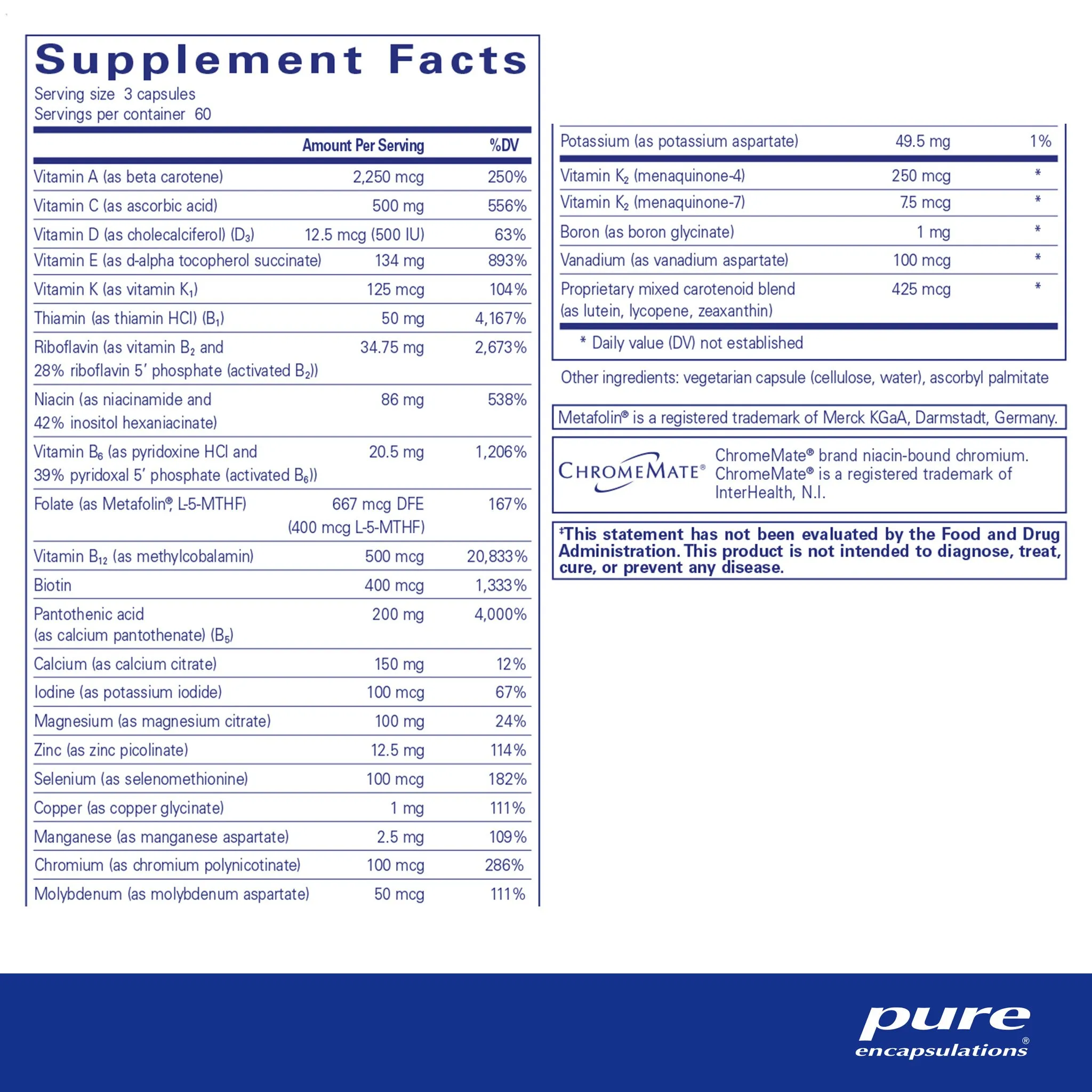 vitamin A (as beta carotene), vitamin C (as ascorbic acid), vitamin D (as cholecalciferol)(D3) (400 IU), vitamin E (as d-alpha tocopherol succinate), vitamin K (as vitamin K1, 65% vitamin K2 (menaquinone-4) and 2% vitamin K2 (menaquinone-7)), thiamin (as thiamin HCl) (B1), riboflavin (as vitamin B2 and 28% riboflavin 5' phosphate (activated B2)), niacin (as niacinamide and 42% inositol hexaniacinate), vitamin B6 (as pyridoxine HCl and 39% pyridoxal 5' phosphate (activated B6)), folate (as Metafolin®, L-5-MTHF), vitamin B12 (as methylcobalamin), biotin, pantothenic acid (as calcium pantothenate) (B5), calcium (as calcium citrate), iodine (as potassium iodide), magnesium (as magnesium citrate), zinc (as zinc picolinate), selenium (as selenomethionine), copper (as copper glycinate), manganese (as manganese aspartate), chromium (as chromium polynicotinate), molybdenum (as molybdenum aspartate), potassium (as potassium aspartate), boron (as boron glycinate), vanadium (as vanadium aspartate), proprietary mixed carotenoid blend (as lutein, lycopene, zeaxanthin), vegetarian capsule (cellulose, water), ascorbyl palmitate