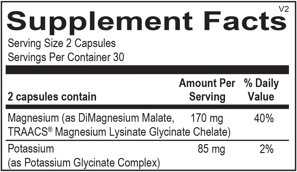 Magnesium (as DiMagnesium Malate, TRAACS® Magnesium Lysinate Glycinate Chelate), Potassium (as Potassium Glycinate Complex), null