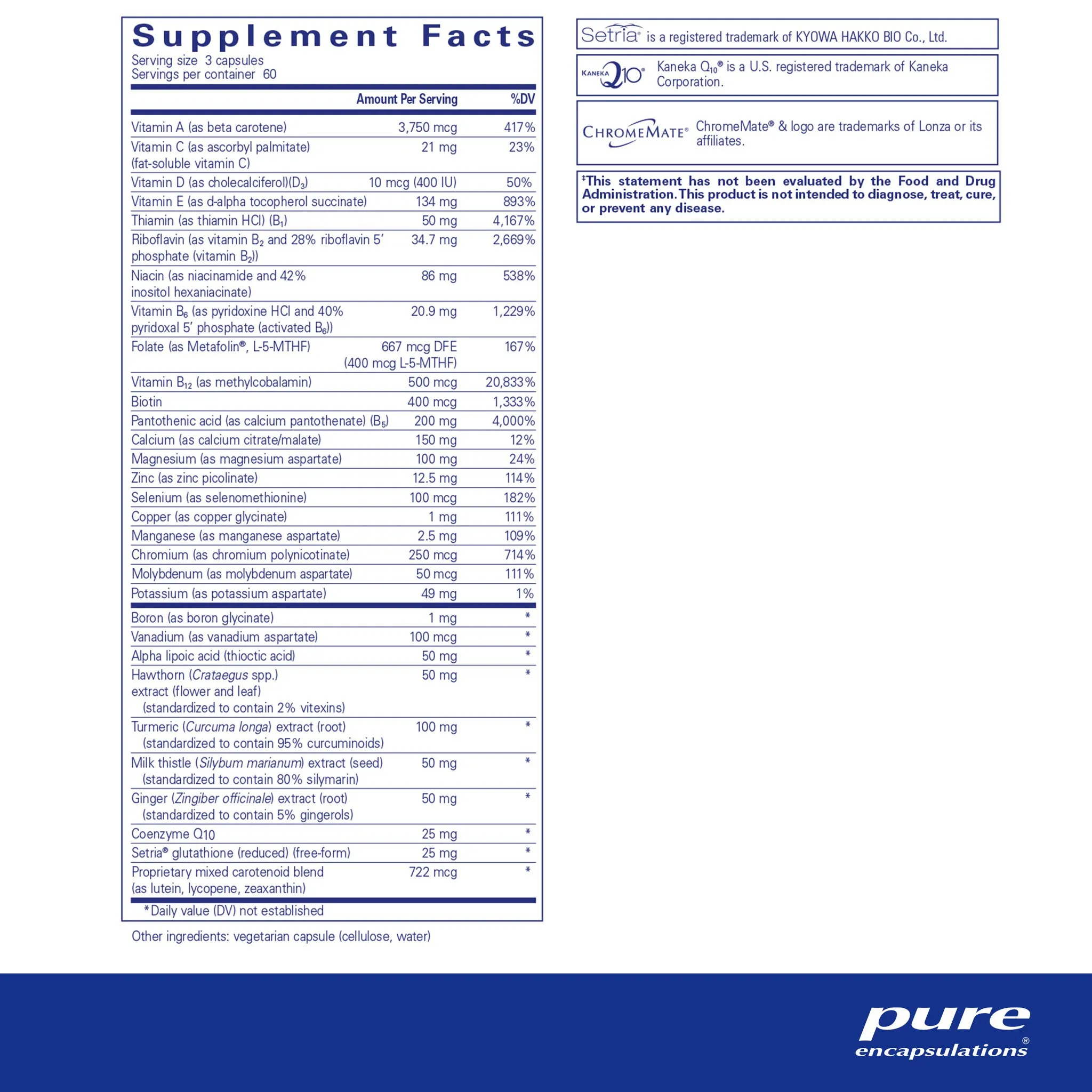 vitamin A (as beta carotene), vitamin C (as ascorbyl palmitate), vitamin D (as cholecalciferol)(D3) (400 IU), vitamin E (as d-alpha tocopherol succinate), thiamin (as thiamin HCl) (B1), riboflavin (as vitamin B2 and 28% riboflavin 5' phosphate (activated B2)), niacin (as niacinamide and 42% inositol hexaniacinate), vitamin B6 (as pyridoxine HCl and 40% pyridoxal 5' phosphate (activated B6)), folate (as Metafolin®, L-5-MTHF), vitamin B12 (as methylcobalamin), biotin, pantothenic acid (as calcium pantothenate) (B5), calcium (as calcium citrate/malate), magnesium (as magnesium aspartate), zinc (as zinc picolinate), selenium (as selenomethionine), copper (as copper glycinate), manganese (as manganese aspartate), chromium (as chromium polynicotinate), molybdenum (as molybdenum aspartate), potassium (as potassium aspartate), vanadium (as vanadium aspartate), boron (as boron glycinate), proprietary mixed carotenoid blend (as lutein, lycopene, zeaxanthin), alpha lipoic acid (thioctic acid), coenzyme Q10, hawthorn (Crataegus spp.) extract (flower and leaf), ginger (Zingiber officinale) extract (root), turmeric (Curcuma longa) extract (root), milk thistle (Silybum marianum) extract (seed), Setria® glutathione (reduced form), vegetarian capsule (cellulose, water)