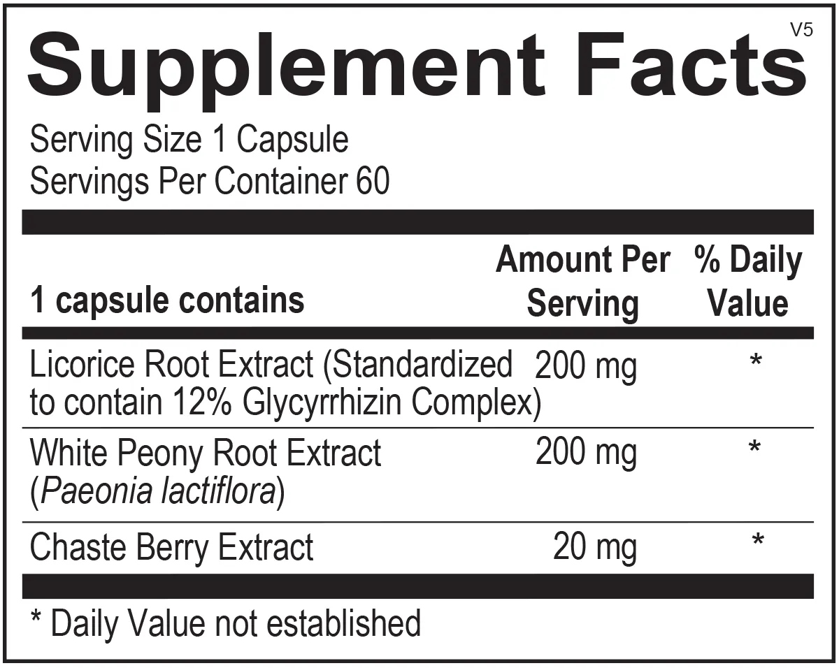 Licorice Root Extract (Standardized to contain 12% Glycyrrhizin Complex), White Peony Root Extract ((Paeonia lactiflora)), Chaste Berry Extract