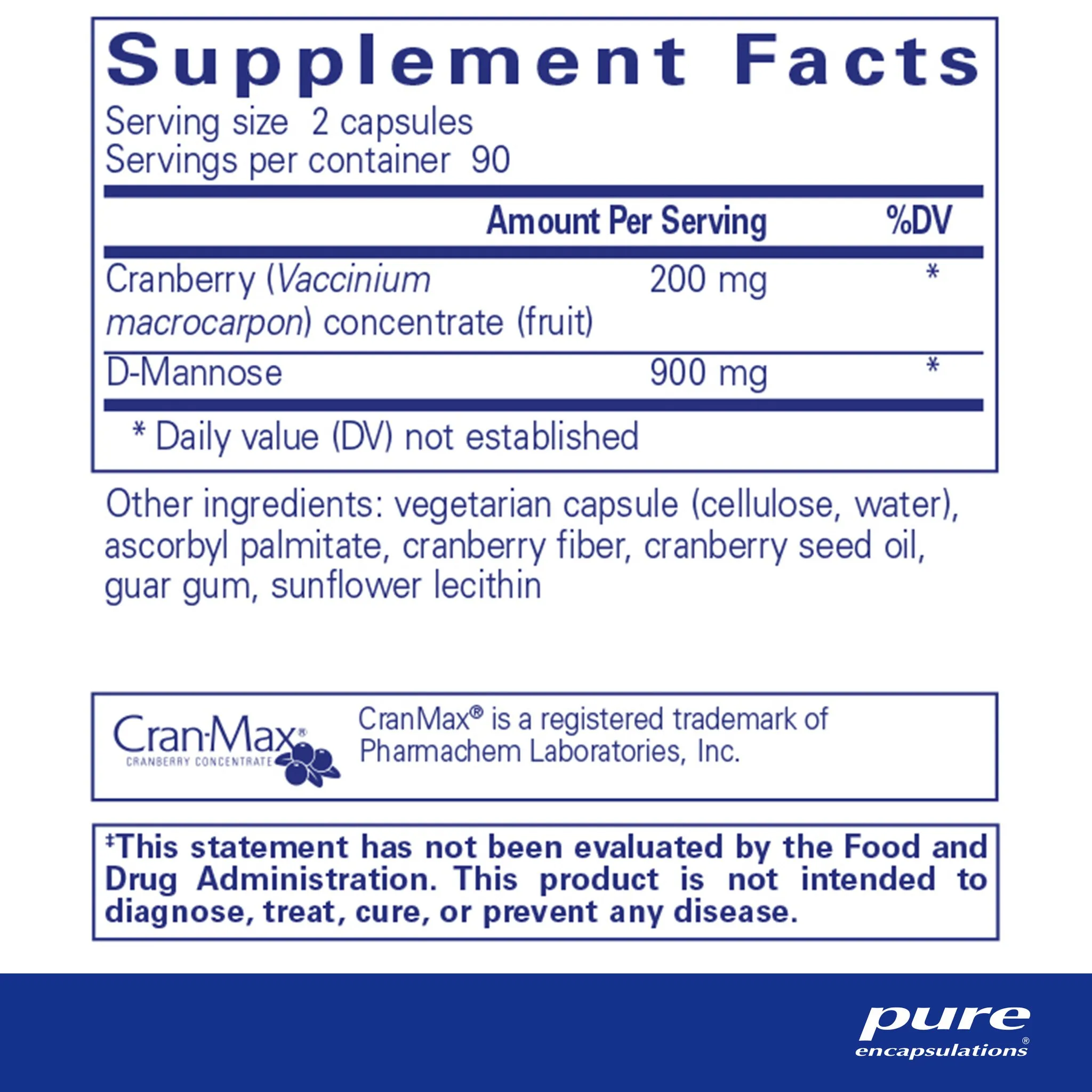 cranberry (Vaccinium macrocarpon) concentrate (fruit), d-mannose, vegetarian capsule (cellulose, water), ascorbyl palmitate, cranberry fiber, cranberry seed oil, guar gum, sunflower lecithin