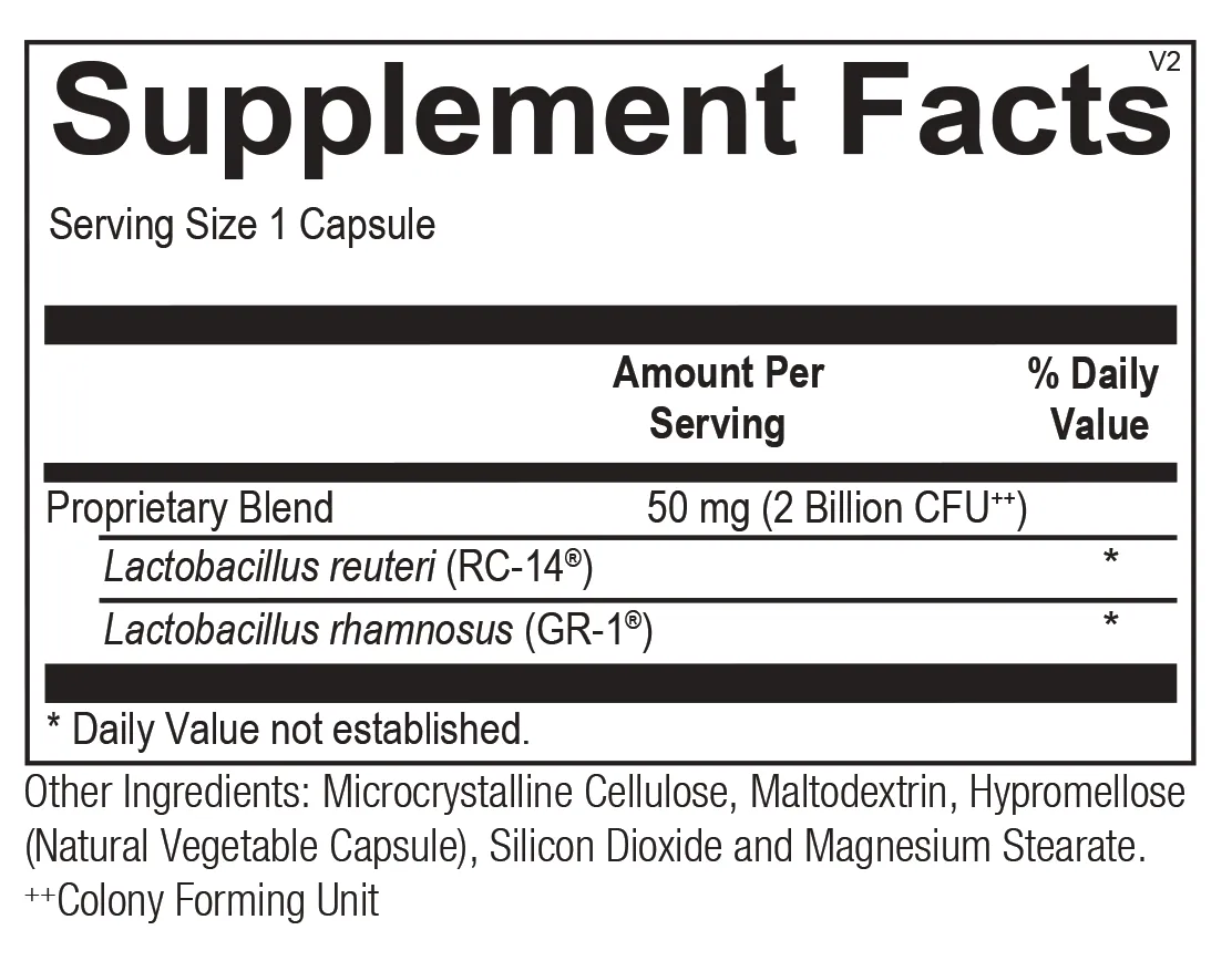 Proprietary Blend, Lactobacillus reuteri (RC-14®) and Lactobacillus rhamnosus (GR-1®), Microcrystalline Cellulose, Maltodextrin, Hypromellose (Natural Vegetable Capsule), Silicon Dioxide and Magnesium Stearate.