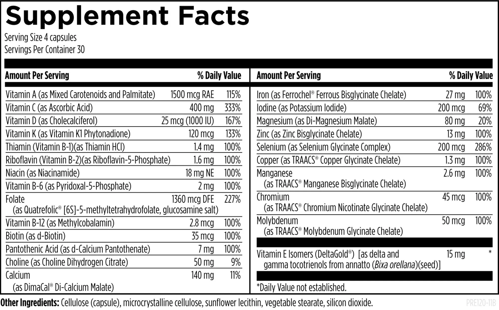 Vitamin A (as Mixed Carotenoids and Palmitate), Vitamin C (as Ascorbic Acid), Vitamin D (as Cholecalciferol), Vitamin K (as Vitamin K1 Phytonadione), Thiamin (Vitamin B-1)(as Thiamin HCl), Riboflavin (Vitamin B-2)(as Riboflavin-5-Phosphate), Niacin (Vitamin B-3)(as Niacinamide), Vitamin B-6 (as Pyridoxal-5-Phosphate), Folate (as Quatrefolic® [6S]-5-methyltetrahydrofolate, glucosamine salt), Vitamin B-12 (as Methylcobalamin [MecobalActive®]), Biotin (as d-Biotin), Pantothenic Acid (as d-Calcium Pantothenate), Calcium (as DimaCal® Di-Calcium Malate), Iron (as Ferrochel® Ferrous Bisglycinate Chelate), Iodine (as Potassium Iodide), Magnesium (as Di-Magnesium Malate), Zinc (as Zinc Bisglycinate Chelate), Selenium (as Selenium Glycinate Complex), Copper (as TRAACS® Copper Glycinate Chelate), Manganese (as TRAACS® Manganese Bisglycinate Chelate), Chromium (as TRAACS® Chromium Nicotinate Glycinate Chelate), Molybdenum (as TRAACS® Molybdenum Glycinate Chelate), Choline (as Choline Dihydrogen Citrate), Vitamin E Isomers (as DeltaGold® delta and gamma tocotrienols), Cellulose (capsule), microcrystalline cellulose, sunflower lecithin, vegetable stearate, silicon dioxide.